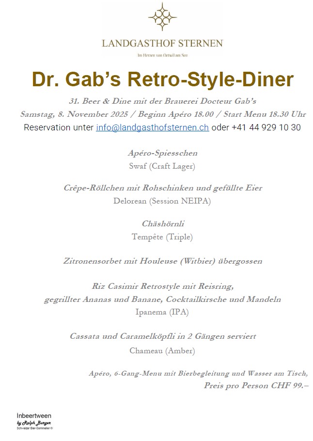 Donnerstag, 21. September 2023: Beer & Dine GFB Landgasthof Sternen, Oetwil am See.